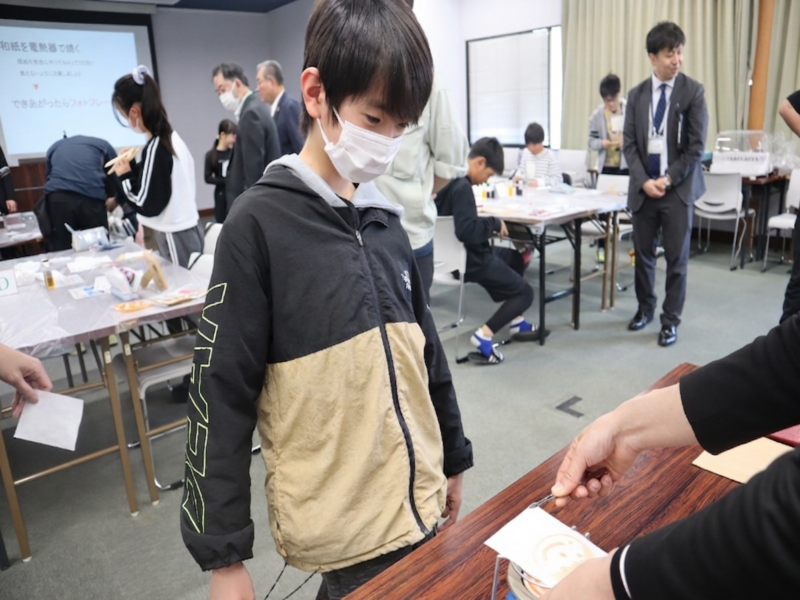 三重大学URAの紀平征希氏が講師を務め、忍者の伝統的な情報伝達術である「あぶり出し」や「水出し」を体験し、忍術を科学的な視点から学ぶことができました。完成した作品はフォトフレームに収め、大切な思い出として持ち帰られました。